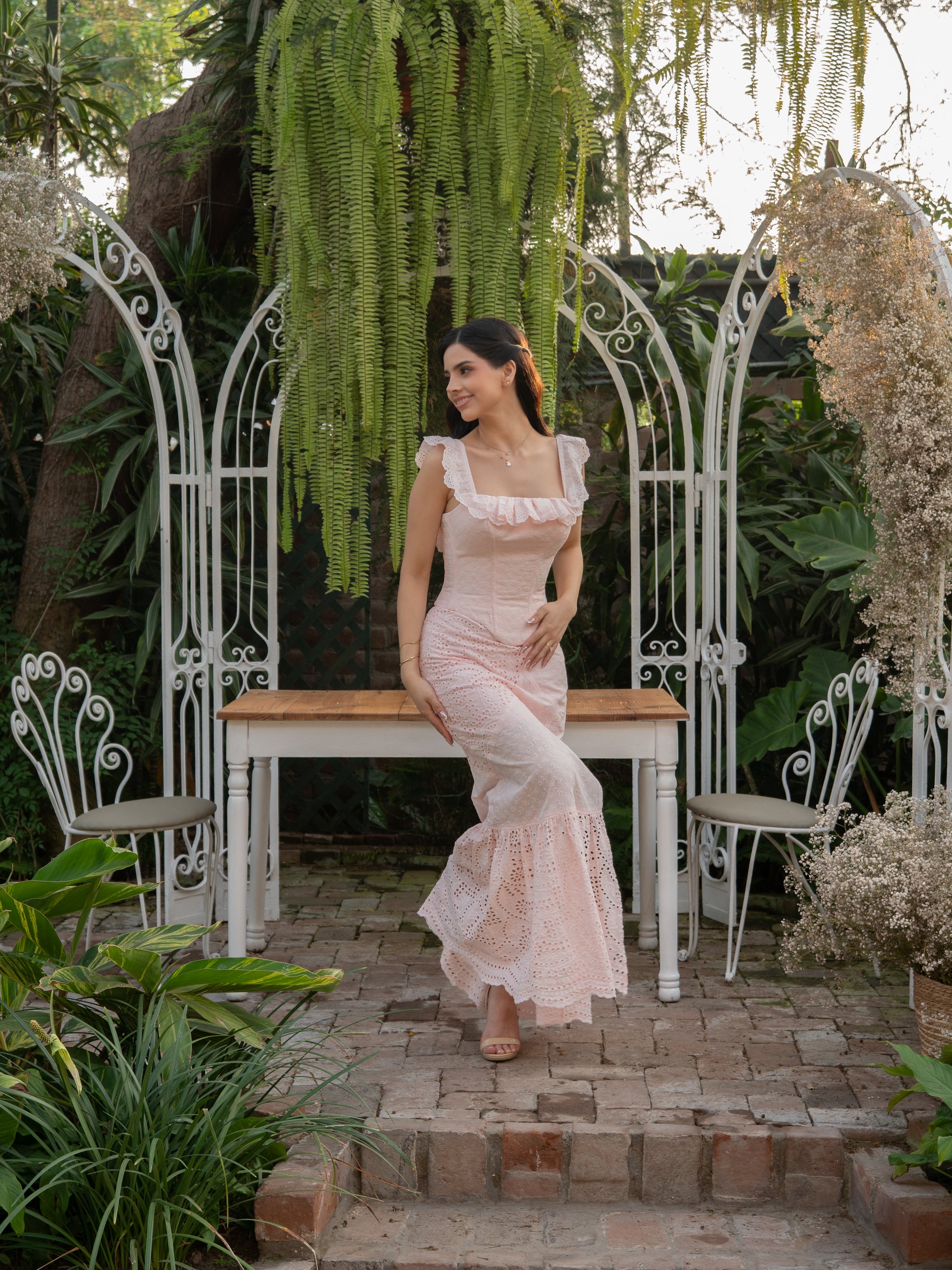 Confeccionada en broderie, combina distintos diseños de flores y espirales que enriquecen visualmente la prenda. Cuenta con forro interno de popelina que brinda comodidad y un acabado prolijo. La abertura en la pierna izquierda añade un toque sutil de sensualidad, equilibrando elegancia y frescura.